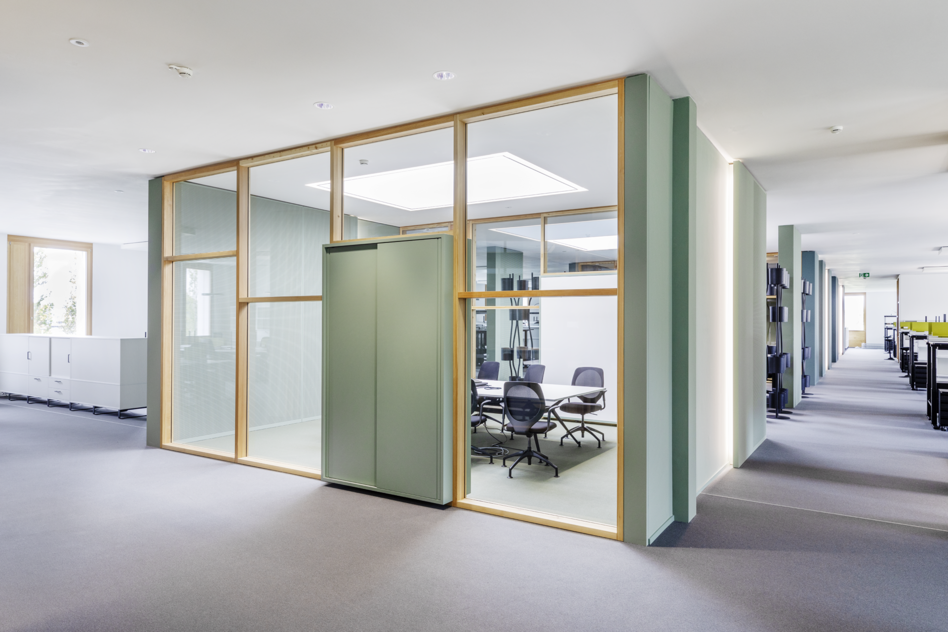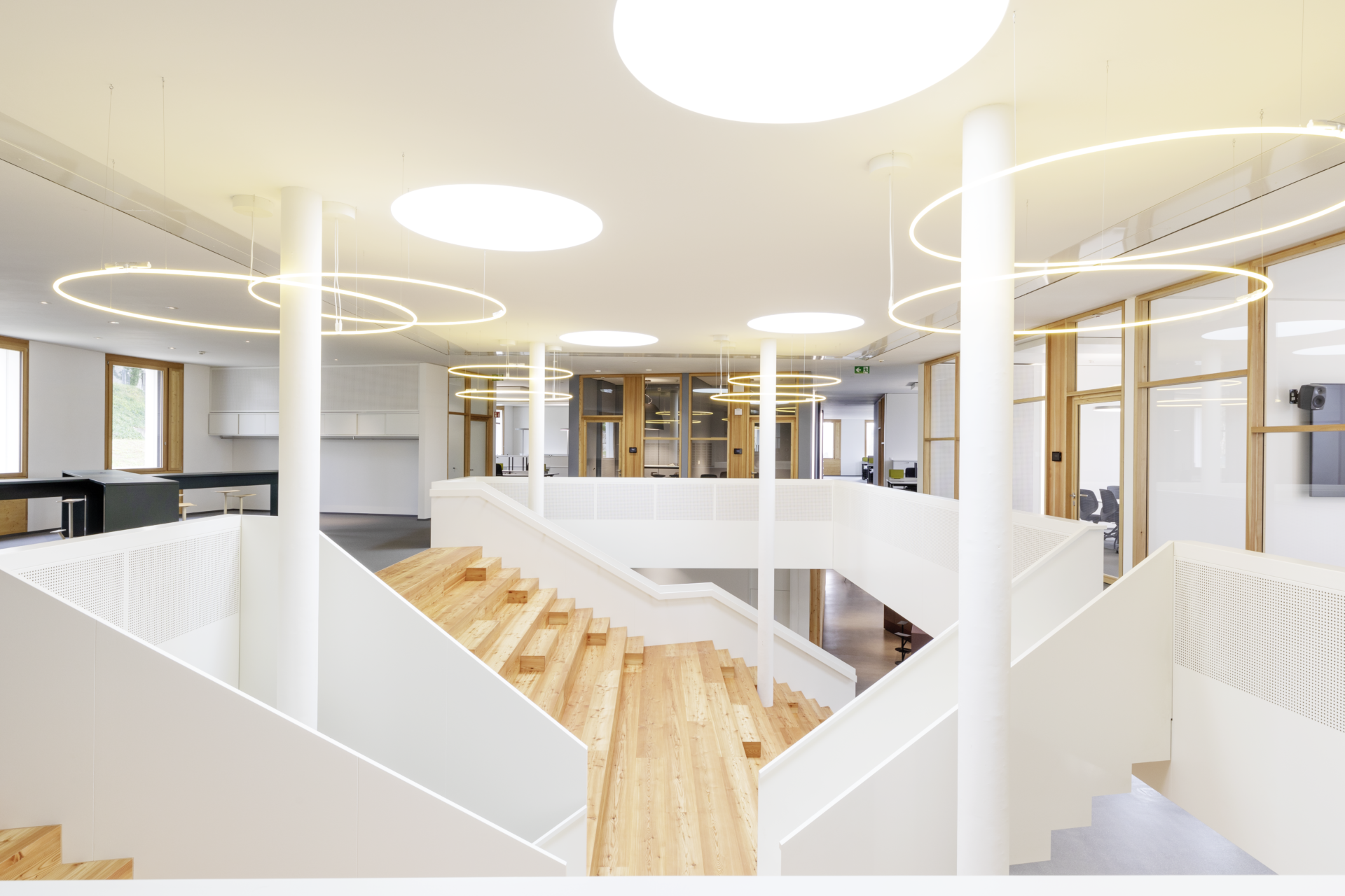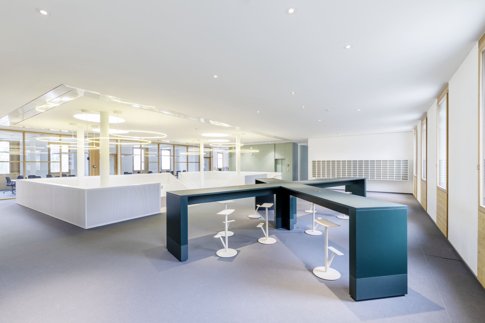Die offene Gebäudestruktur und das angewendete Ausstattungskonzept fördert die Kommunikation zwischen den Mitarbeitenden.