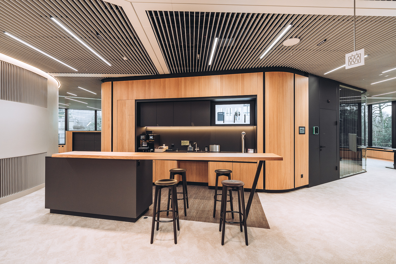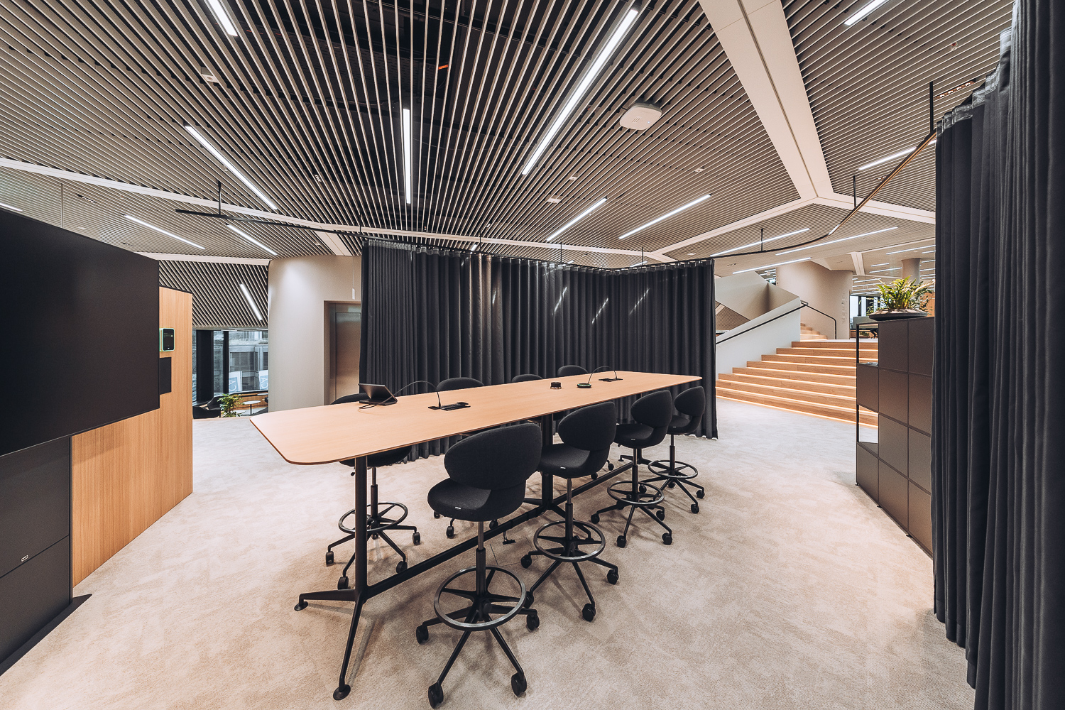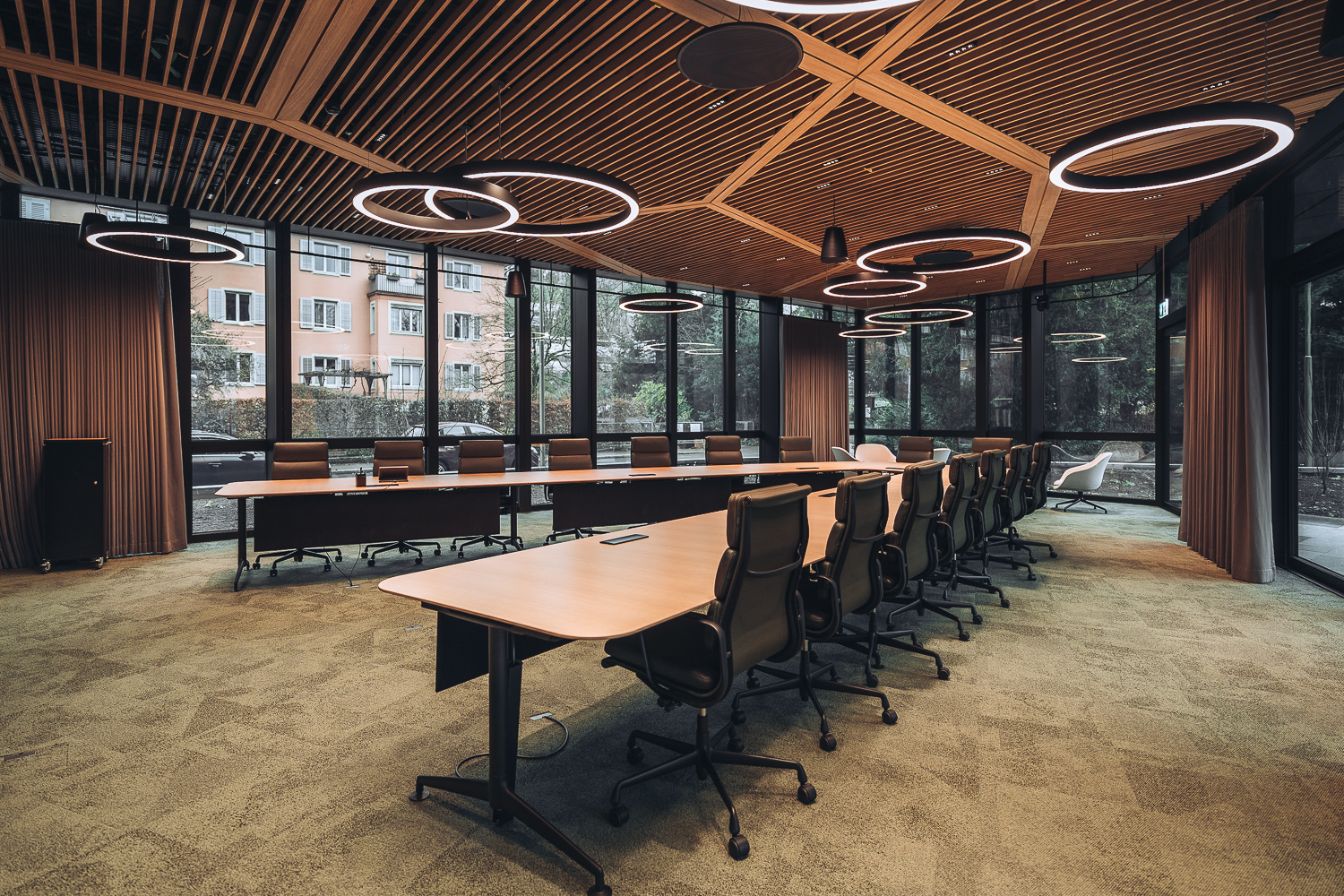 Das Einrichtungskonzept des Hauptsitzes basiert auf der Idee von ruhigem und zeitlosen Design mit echten Materialien.